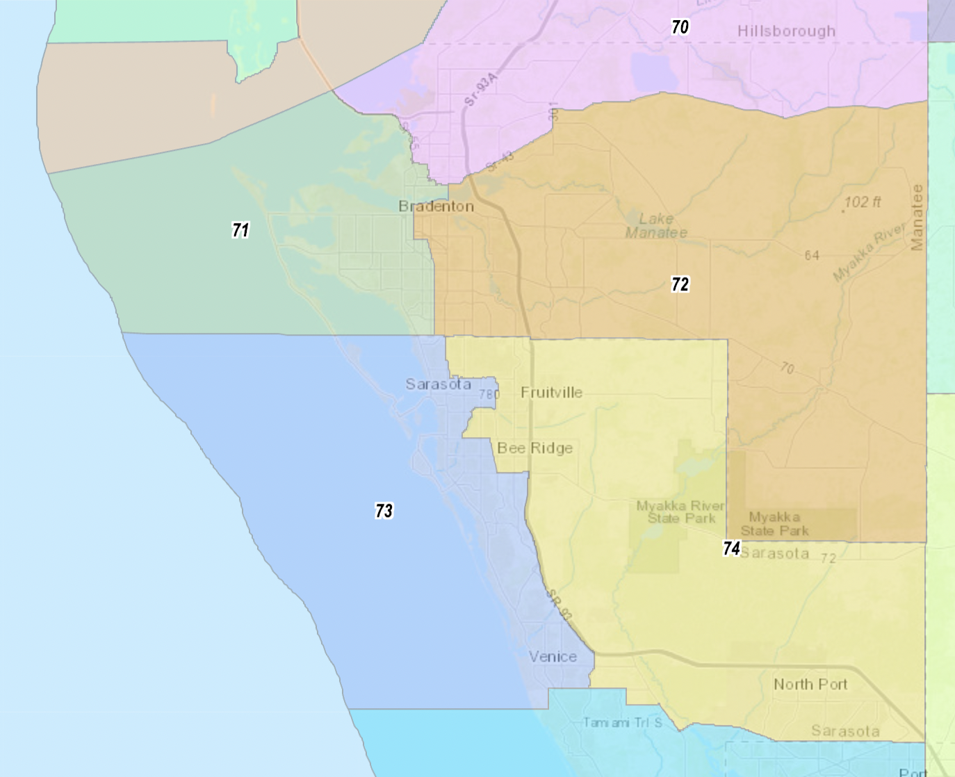 But getting to the most urgent consequence, this map as drawn today places Reps. James Buchanan, R-Venice, and Tommy Gregory, R-Sarasota, in the same House district. The new House District 74 would include most of east Sarasota County, including everything east of Interstate-75.