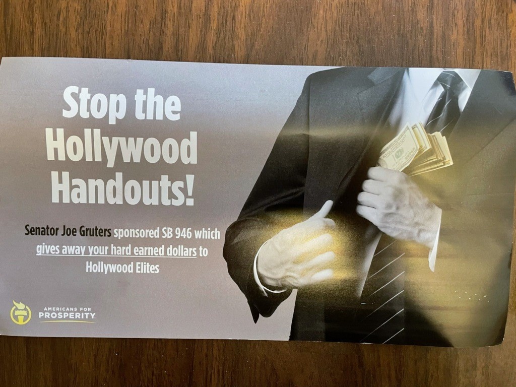 The words “Stop the Hollywood Handouts!” blared in large type on political mailers sent by Americans For Prosperity, a right-leaning group that has opined against any types of incentives for years. The mailers also included a picture of Sen. Joe Gruters, R-Sarasota, who for several years has sponsored legislation to create a new rebate program.