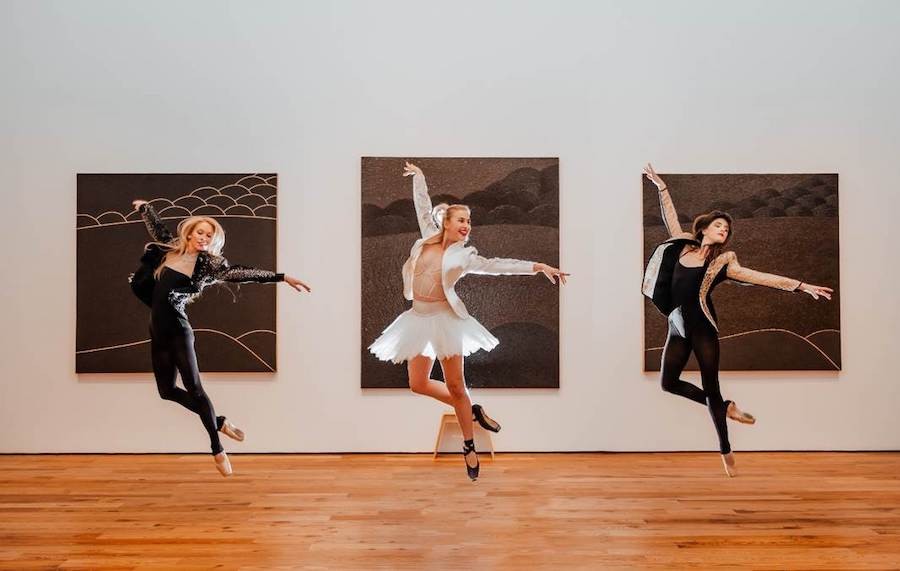 Pictured: Fovari modeled by Sarasota Ballet dancers Danni Rae, Melanie Wells, and Taylor Sambola at Sarasota Art Museum with the art of David Budd.
