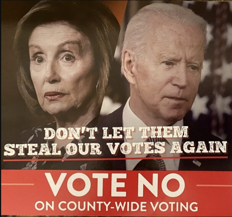 The rest of the type on the mailer lays out objections to a county referendum being voted on March 8. If passed, the county will hold county-wide elections for commissioners and abandon single-member elections, a system approved by voters less than four years ago.
