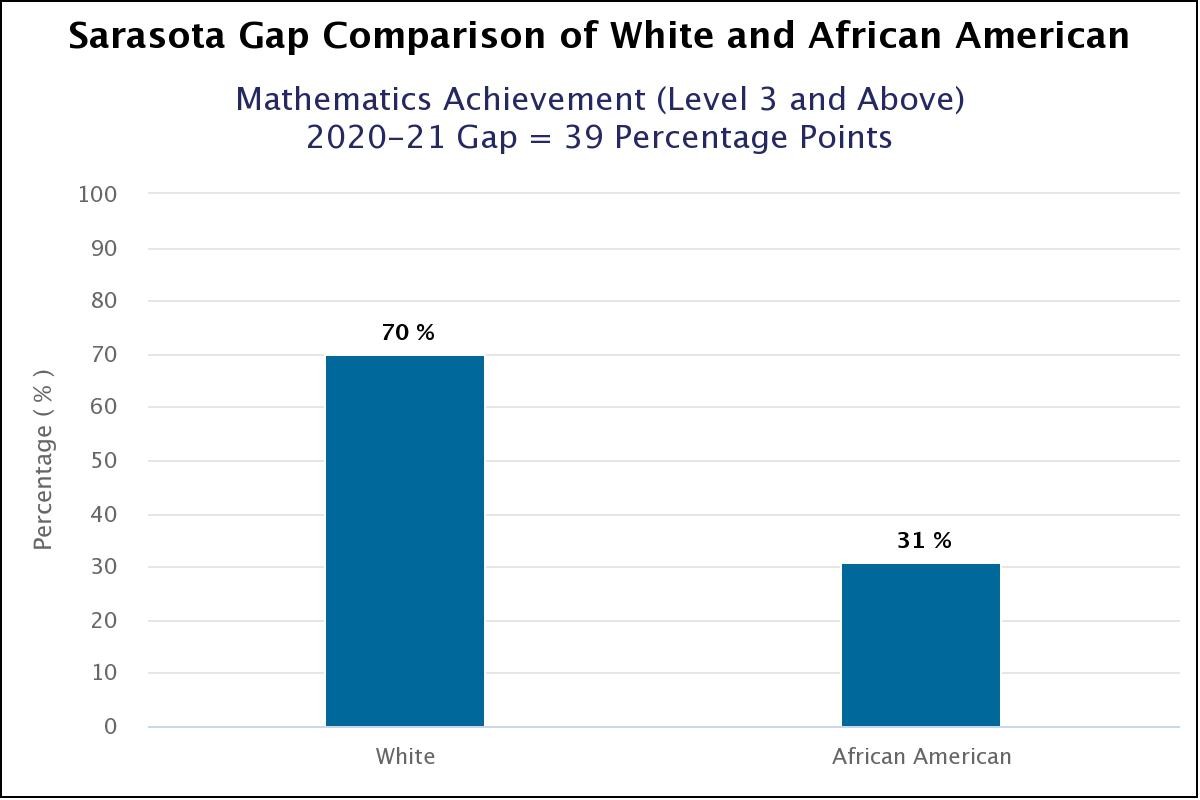 English is just as bad; there is a 35-point achievement gap differential between whites and blacks in English. Our English achievement gap in Sarasota County is six percentage points worse than the gap statewide.
