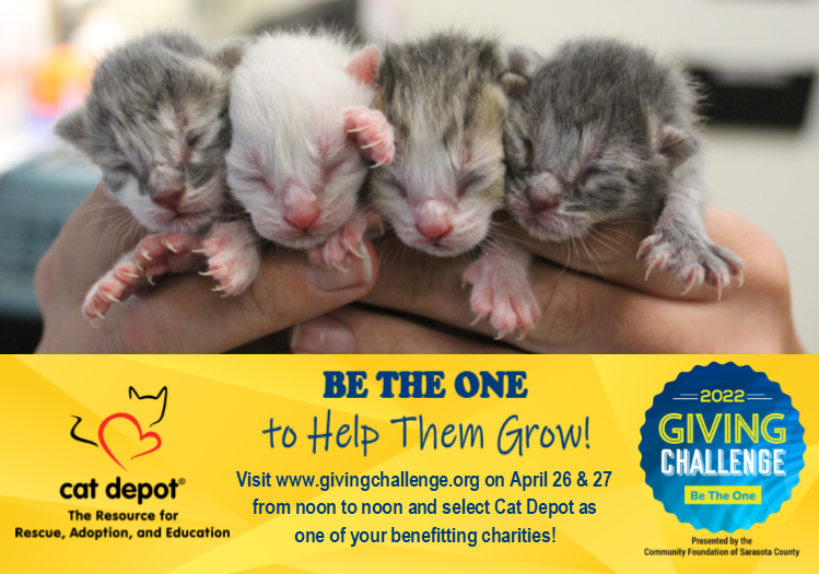Did you know that Cat Depot will rescue and care for over 800 kittens this year? With Kitten Season upon us, your support is needed now more than ever. It also makes our 2022 Giving Challenge theme - “BE THE ONE TO HELP THEM GROW” – even timelier.
