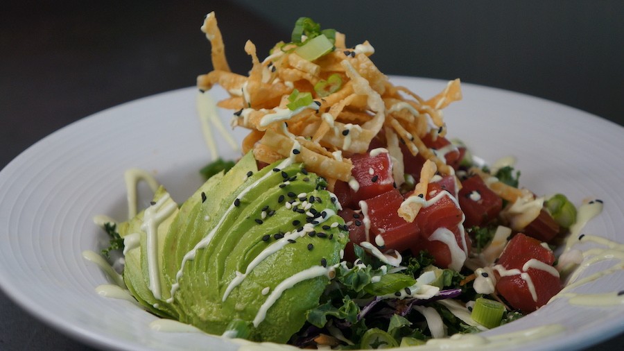 Pictured: The Poke Tuna Bowl at Geckos Grill & Pub is a crisp, colorful concoction of shaved veggies, marinated rare yellowfin tuna, Asian vinaigrette, wontons and wasabi cream. Photo courtesy of Gecko's.