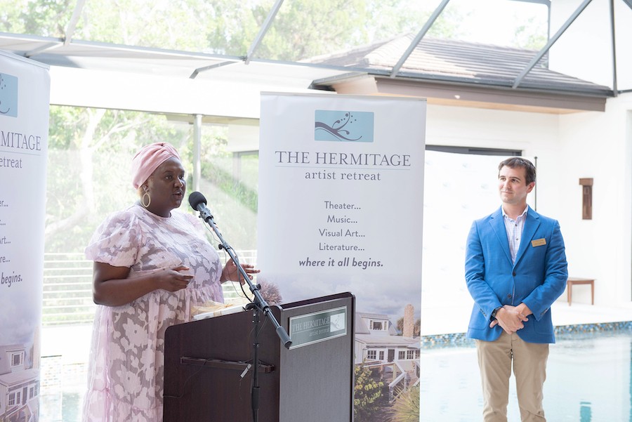 Pictured: Shariffa Ali accepts the 2022 HMTA from Hermitage Artistic Director and CEO Andy Sandberg. Photo Credit: Hermitage Artist Retreat / Whitney Patton.