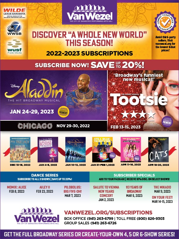 The 2022-2023 Subscription Series has been announced at the Van Wezel Performing Arts Hall. This incredible lineup features nine Broadway shows, with four Sarasota premieres, three dance productions, and four subscriber specials.