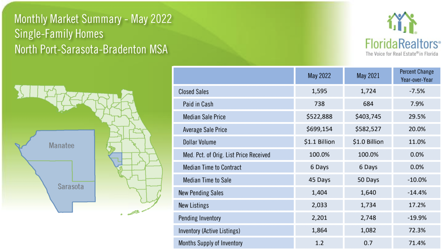 For the second month in a row, the inventory of active listings in the two-county area increased year-over-year in May 2022. According to data from Florida Realtors and compiled by the Realtor Association of Sarasota and Manatee, the residential market also reports the highest-recorded prices for all property types in both counties, along with fewer closed sales and an increase in new listings.