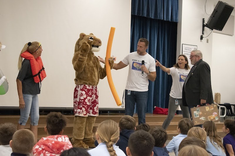 The excited cheers of Cranberry Elementary School students greeted the joyful return of Cooper, the school’s world-traveling cougar mascot, at a celebration that capped a weeks-long experiential learning adventure dubbed “The Great Cooper Caper.” Cranberry Principal Brad Porinchak made the announcement that Cooper, who had not reported back to school as expected from his far-flung summer travels, had been spotted near campus that morning. On cue, Cooper, wearing bathing trunks and carrying a swim noodle, was escorted into the school’s cafeteria by North Port Mayor Pete Emrich, Commissioners Jill Luke and Barbara Langdon, and City Manager Jerome Fletcher. The North Port officials were called to deliver Cooper back to Cranberry students after he was discovered lounging at the North Port Aquatic Center surrounded by hot dog wrappers. Clearly relishing the exuberant welcome back party, Cooper encouraged students to explore new places and keep learning but assured them that of all the beautiful places he traveled and all the wonderful people he met, there was no better place than Cranberry Elementary School. “The Great Cooper Caper” was a CSI-style immersive mystery customized for Cranberry through a schoolwide grant from the Education Foundation of Sarasota County. The academic scenario was created in coordination with University of South Florida science professors Dr. Mitch Ruzek and Dr. Dana Zeidler of Immersive Academics. Students in all K-5 grade levels at Cranberry Elementary engaged in the forensic-style inquiry-based learning adventure as they looked for clues to solve the mystery of Cooper’s whereabouts. Following the clues led students to track where he went, what he did, who he met, and the history, culture, geography and interesting facts about landmarks he visited. The immersive mystery integrated collaborative interdisciplinary schoolwide curriculum and investigative problem-solving to help K-5 students attain a higher level of scientific literacy, develop inquiry skills, and to better model authentic academic habits of mind. The examination also incorporated state standards and curricula including earth space, geology, American and world history, writing, reading, and more disciplines.