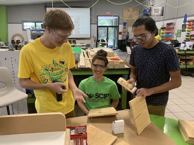 Pictured: Student volunteers Aaron, Olivia and Daniel undergo equipment and tool training. Photo courtesy of Suncoast Science Center.