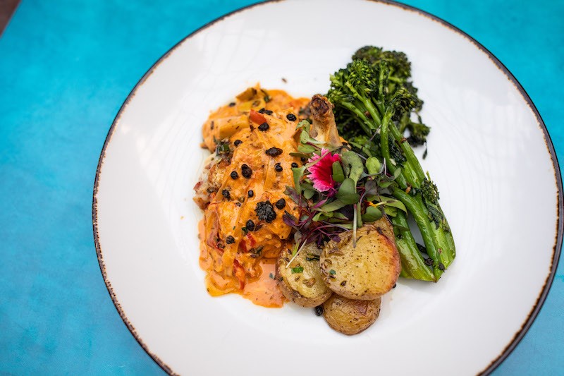 Pictured: Prosciutto di Parma & Aged Fontina-Stuffed Chicken Breast Creamy Tuscan Artichokes & Oven-Dried Tomato Sauce Crispy Capers and Toasted Fennel Oil, Broccolini and Creamer Potatoes. Photo courtesy of Michaels on East.