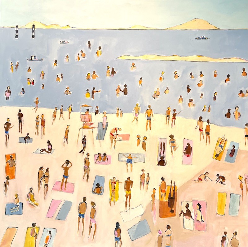 In 2021, the artist’s solo exhibit at the MARA Art Studio + Gallery featured 365 paintings created and posted daily during the first year of the pandemic. “As I continue to be inspired by the shapes and colors of boats, water and the enormous Florida sky, the big surprise is that humans have begun to populate my paintings, as if joining the world again,” says Di Franza. “The paintings in this new show are born of a new time, as we emerge after the crisis and isolation of the pandemic. We are face to face with each other again. Our re-entry into the world has propelled us all to reimagine our lives and reimagine the future. Where do we belong? What are we waiting for? How do we reconnect? Are we finding our way back to the familiar or blazing new pathways? What happens next?”