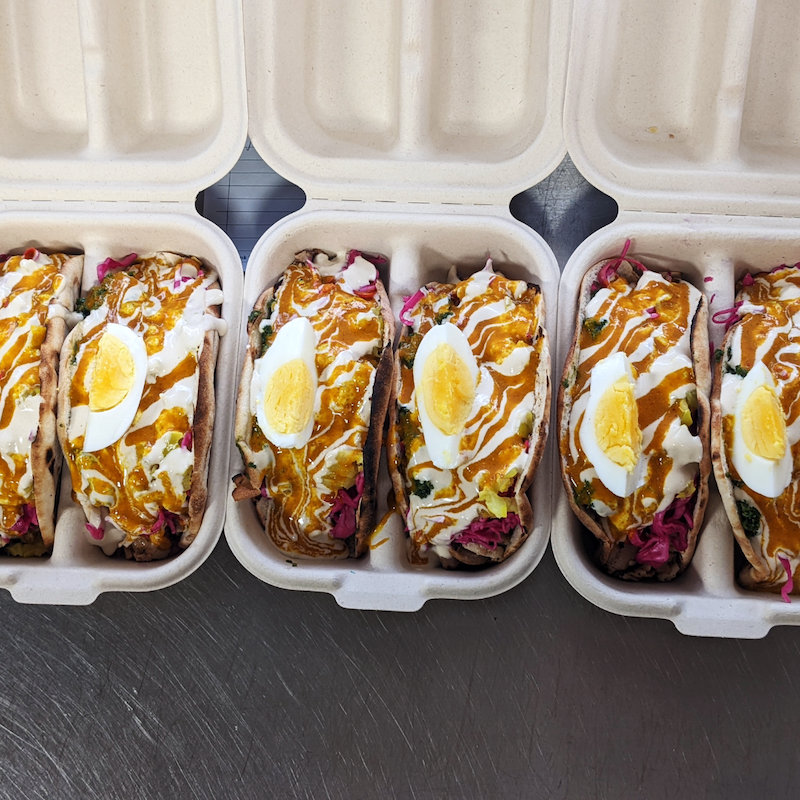 My family and I stopped by for lunch this past weekend, and Sarasota clearly has a new breakout star with Florence and the Spice Boys’ chicken shawarma. They’re billed as tacos, and the shells are fresh, robust pita that engulf a high pile of chicken thigh. Schmitt tells SRQ that the chicken is marinated in her team’s signature spice blend. It’s served with a crispy pickled slaw, some mild banana peppers, and a spicy Middle Eastern sauce called zhug. There’s also tahini and an Israeli sauce called amba. Topping it all is a quarter of an expertly boiled egg.