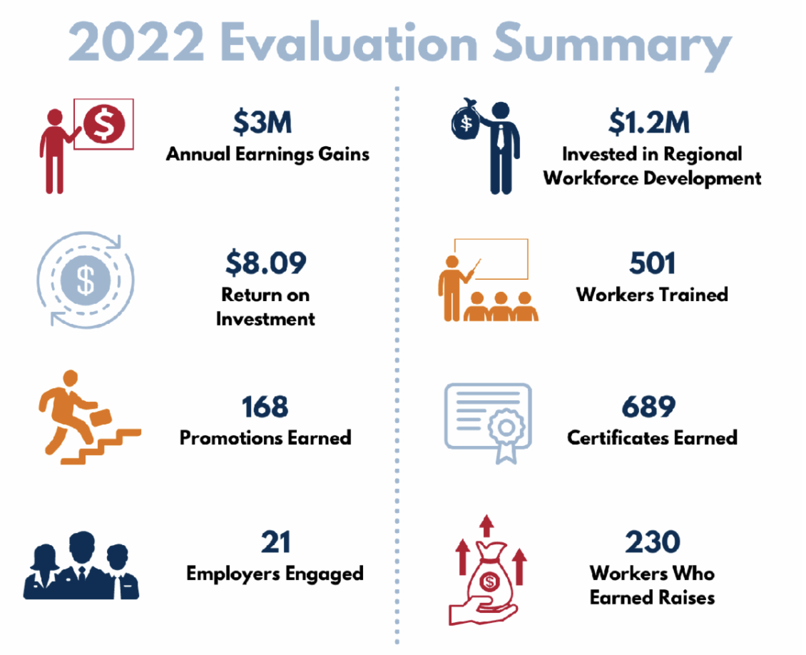About $1.16 million was invested in the program in 2022, helping provide training to 501 employees in the region and certifications for 689. The effort provides on-the-job training and reimbursements for paid internships, as well as a Bridge to Careers fast-tracking program and upskilling efforts that have led directly toward increases in wages.