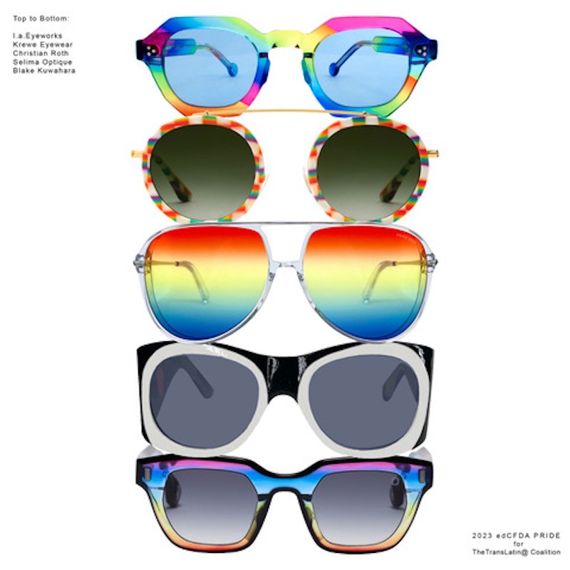 In honor of Pride Month in June, five independent CFDA eyewear designers are unit-ing to launch the second annual edCFDA Pride Eyewear Initiative. The designers of Blake Kuwahara Eyewear, Christian Roth Eyewear, Krewe Eyewear, l.a.Eyeworks and Selima Optique, will each offer a limited edition sunglass design, with a portion of pro-ceeds collectively benefiting the TransLatin@ Coalition. Accompanying the limited edi-tion eyewear designs is a dedicated lens cleaning cloth created exclusively for the ini-tiative by New York-based artist Pedro Silva. The “edCFDA Pride Eyewear Initiative” is an annual charitable venture driven by inde-pendent eyewear designers of the CFDA to target and highlight specific needs within the broad spectrum of the LGBTQIA+ and gender non-conforming community.Blake Kuwahara. Collective proceeds from this year’s effort will benefit the TransLatin@ Coalition, whose members are TransLatin@ leaders from different parts of the U.S., who organ-ize and advocate for the issues and needs of TransLatin@ individuals residing in the United States. translatinacoalition.org The designers – Blake Kuwahara (Blake Kuwahara Eyewear), Christian Roth (Chris-tian Roth Eyewear), Gai Gherardi (l.a.Eyeworks), Selima Salaun (Selima Optique), Stirling Barrett (Krewe Eyewear) – are members of the Eyewear Designers of the Council of Fashion Designers of America (edCFDA), a working group of the CFDA that seeks to expand the understanding and presence of designer eyewear as a vital com-ponent of contemporary fashion. cfda.com.