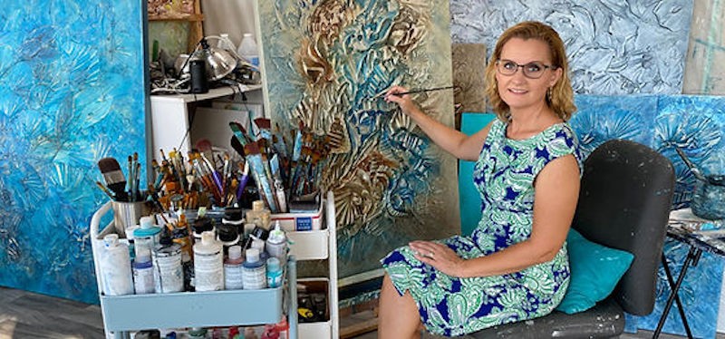 “Sveta Osborne is from Belarus, where she grew up next to a sculptor who really inspired her textural style of painting,” says Robyn Holl, the Cultural Curator at Sarasota’s Art Ovation Hotel. “Now, she resides in Cape Coral, where you can see the Gulf Coast has a huge influence on her art–Sveta has about 14 to 15 paintings of hers throughout the lobby as a part of her exhibit, The Ocean, all of which are inspired by beaches, shells and seascapes.”