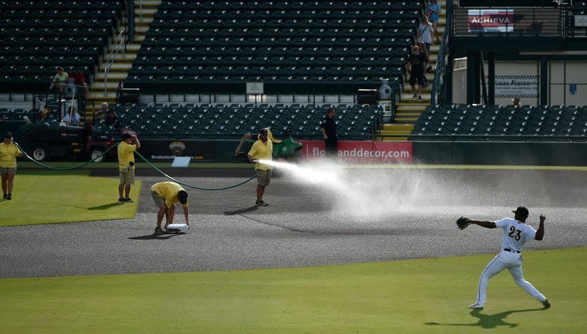 Pictured: Pregame warm-up work at LECOM Park. Photo by Thomas Bender at the Sarasota Herald-Tribune.