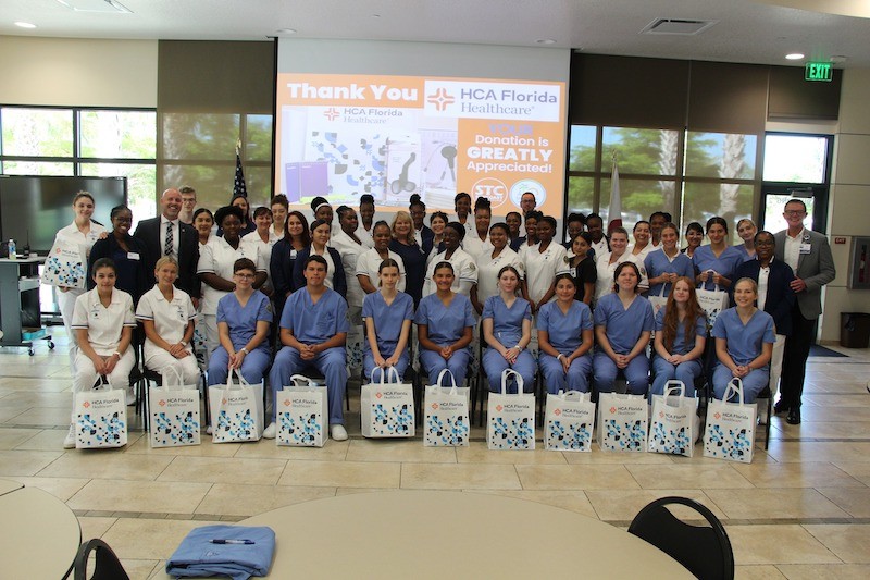 HCA Florida Sarasota Doctors Hospital collected school supplies for students in the nursing program at Suncoast Technical College (STC). Nursing leaders from the hospital presented the supplies to students on the first day of school, Thursday. Supplies for 110 students in the nursing program at STC’s schools in Sarasota and North Port were donated by the hospital. The Chief Nursing Officer, Assistant Chief Nursing Officer and other nursing leaders from HCA Florida Sarasota Doctors Hospital presented the nursing and school supplies to students in the practical nursing and nursing assistant program at Suncoast Technical Collage. Through the month of July caregivers at the hospital collected school supplies as part of the We Show Up for our Communities School Drive. More than $8,000 worth of supplies were collected and donated to the school. Supplies include stethoscopes, surgical sheers, pen lights, gait belts, highlighters, pens, binders and bags. There are more than 1,400 different items. These supplies were put in individual bags and presented to the students on their first day of school. Hospital leaders spoke to students about nursing careers, offered advice, answered questions and wished the students a successful school year.