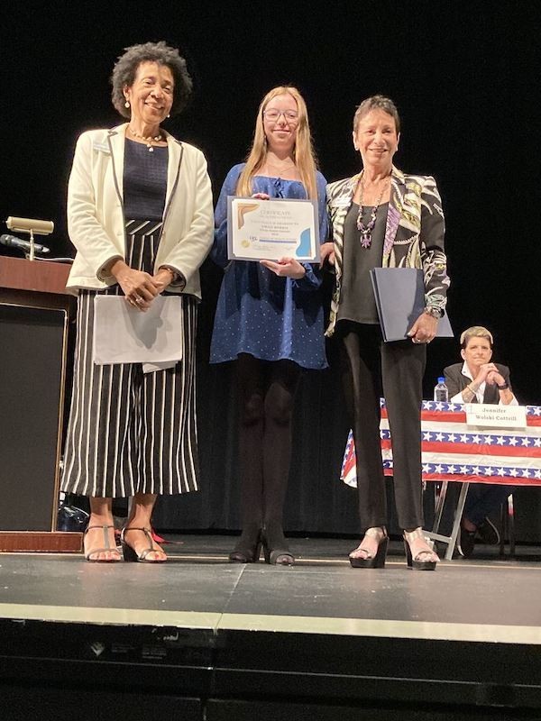 Pictured: (l-r) Cecile M. Scoon, Esq., Co-President, LWVFL, Emily Morris, a Suncoast Technical College student who won 1st place last year for her poster, People Power, and Jill Lewis-Spector, Ed.D.