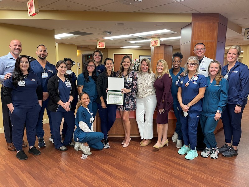 On a typical day, Stephanie Kent, RN moves quickly through the halls and floors of HCA Florida Sarasota Doctors Hospital. She starts her day volunteering to vaccinate caregivers for flu season, then meets with her team in ICU and then moves to the progressive care unit to meet caregivers she supervises. In between, she stops to offer encouragement to patients and their families and then snaps photos to celebrate the achievement of a new nurse. She does all this before starting her full time responsibilities as the Director of Critical Care, overseeing the intensive care unit and the progressive care unit. Recently, Chief Nurse Executive for the West Florida Division of HCA Florida Healthcare Leanne Salazar stopped by the hospital to present Kent with the West Florida Division DAISY Award. The DAISY Foundation sponsors this international award to recognize nurses for extraordinary compassion and skillful care. Nurses can be nominated by patients, families or their peers. Stephanie Kent, RN is only the second nurse to earn the division DAISY Award. Kent started her nursing career as a nurse extern, then worked in the medical surgery unit, was promoted to charge nurse and then became a nursing manager at HCA Florida Brandon Hospital during the peak of the COVID-19 pandemic. She has been the Director of Critical Care at HCA Florida Sarasota Doctors Hospital for more than two years.Nursing runs in her family. Her father is a nurse and as a child, she and her mother would visit her father at hospital for lunch. She was inspired seeing the nurses working. “I always wanted to be a nurse, I love people and I love taking care of people, “said Kent.