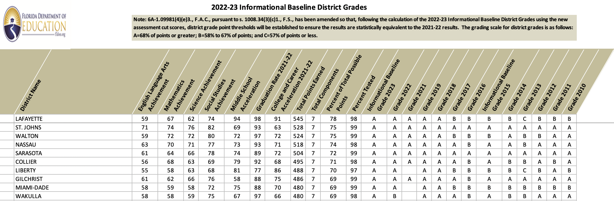 The much-anticipated school grades for the 2022-2023 school year were released under the new assessment system implemented in the State of Florida. Data was released much later than usual and also in parts. The data released this week dealt with District rankings and grades, and also individual school rankings and grades. This column will cover district data.