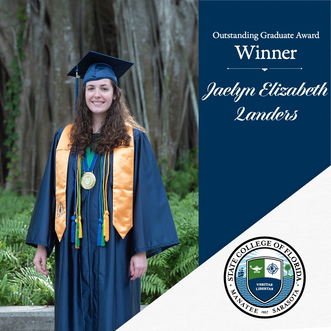 Outstanding graduate award finalist Colton Cook graduated with an associate in arts degree. He is a United States Coast Guard veteran who served four years as an electronic technician in Key West with various deployments and search and rescue missions. Cook was the President of the Student Veterans of America Bradenton Chapter, founded and created the annual SCF Dodgeball Tournament, joined the Phi Theta Kappa Honor Society and participated in numerous volunteer events. Cook knows he wouldn’t be where he is today if he didn’t serve his country and receive the GI Bill and he wants to pay it forward. His true passion lies in fishing, and his ultimate goal is to protect the ecosystem and help prevent over-fishing in Bradenton by working with commercial fisheries.