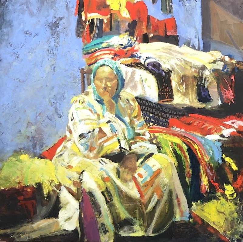 “I just wanted to immerse myself in the experience and whatever was going to happen, was going to happen,” says Pratt of those eventful two months travelling through Morocco in 2016, following the footsteps of his heroes, Eugene Delacroix, Arthur Melville, and John Singer Sargent, all of whom found inspiration in the Kingdom of Morocco. He walked the markets of Marrakesh and the old walled medina in Fes; he traveled from the coastal city of Essaouira to the mountainside city of Chefchaouen, known as the “blue pearl of Morocco,” because all the buildings are painted a vibrant blue. “And I’m a blue junkie, man,” Pratt says. “It was unbelievable.” The more he explored, the more comfortable he became, eventually giving up his hotel room in Marrakesh and staying with a local shopkeep for a week or so, being shown “all the nooks and crannies'' of the city, much of which appears in Carnet de Voyage, in oil paintings of watersellers and jewelry makers, stall merchants and busy streets.