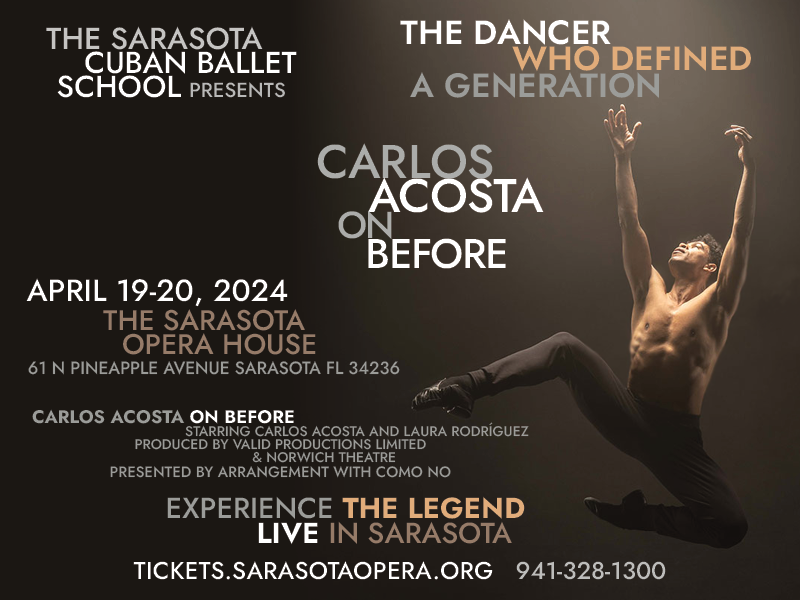 Experience the dance legend live in Sarasota! The Sarasota Cuban Ballet School is honored to present Carlos Acosta On Before at the Sarasota Opera House on April 19-20, 2024. Carlos Acosta is a living legend, a world-renowned dancer whose artistry defined a generation and paved the way for future generations of dancers. He is an internationally recognized and beloved figure who has influenced the dance community and pop culture monumentally. On Before, Acosta’s deeply personal story told through dance, will be his first performance in the US since 2018 and his only US performance is in Sarasota. On Before is an intimate contemporary ballet for just two dancers. Acosta will dance with Laura Rodriguez from Acosta Danza, the company he founded in Havana. On Before features choreography by world-renowned artists, including Russell Maliphant, Kim Brandstrup, and Will Tuckett, alongside Acosta’s choreography. Don’t miss this once in a lifetime experience!