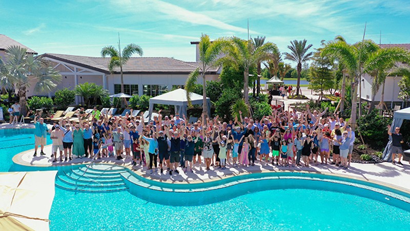Pictured: Aerial of The Resort Club and a photo of the homeowner guests at The Resort Club grand opening event.