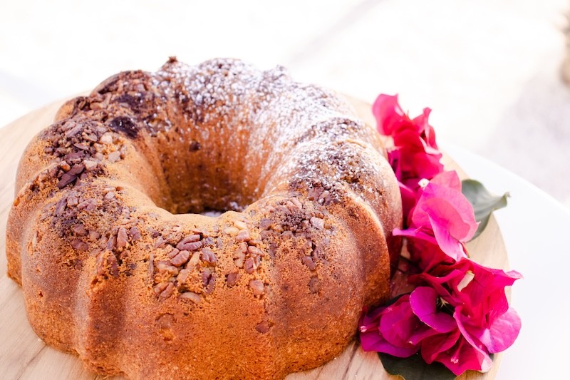 The sensory experience continues when you take a bite. The cake is spongy and incredibly moist, so it holds its shape beautifully but still melts in your mouth. That moisture comes from the rum glaze, which is delicate enough that you can taste the component flavor notes like cardamom, cinnamon, vanilla, and dried orange. Pecans that have been candied in cinnamon and brown sugar and cinnamon are also baked directly into the cake, adding a satisfying crunch and textural element that contrasts with the silky, buttery smoothness of the cake itself.