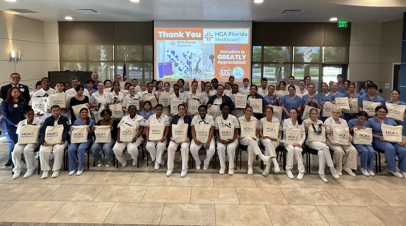 Students studying nursing at Suncoast Technical College got a boost of support on the first day of school. HCA Florida Sarasota Doctors Hospital donated school supplies for every student in the nursing program. More than 120 students received stethoscopes, pen lights and other supplies needed for the nursing program along with supplies like notebooks, pens and markers that are needed in the classroom. Harry Walk, RN, Assistant Chief Nursing Officer at HCA Florida Sarasota Doctors Hospital greeted the students and gave them some advice on a career in nursing. “I didn’t start out to be a nurse, but I wanted to care for people…there are a lot of opportunities to work in different areas in nursing so take all the opportunities afforded to you. Welcome to nursing,” Walk added. “Donations like this are very beneficial. The start-up costs for nursing school can be expensive for some students. This also helps our students build relationships with a potential employer in the community,” said Ron DiPillo, Executive Director of Suncoast Technical College. This is the second year the hospital has donated supplies to all nursing students at Suncoast Technical College.