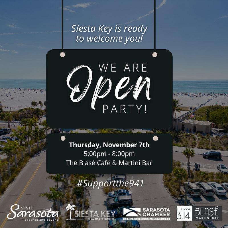 Join the Watershed Hospitality Concepts family, the The Greater Sarasota Chamber of Commerce, Visit Sarasota County, Siesta Key Chamber Of Commerce & friends for a #SiestaStrong & hashtag#Supportthe941 party at Blase Martini Bar on Nov. 7. We'll have two bands, raffles, happy hours, hand-thrown Pi Pizza & FUN...and isn't a little comfort and camaraderie what we all need to show that 'WeAreOpen!' Location — Blase Cafe & 3.14 Pi