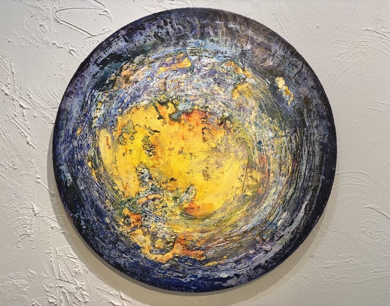 Entitled Orbital Abstractions, the one-room show invites viewers to step into the center of Berger’s universe, surrounded by 20 cosmos-inspired abstract paintings on circular birchwood panels. Tactile and textured, they look like alien worlds waiting to be explored, shaped perhaps by the slow erosion of eons rather than Berger’s bare hands.