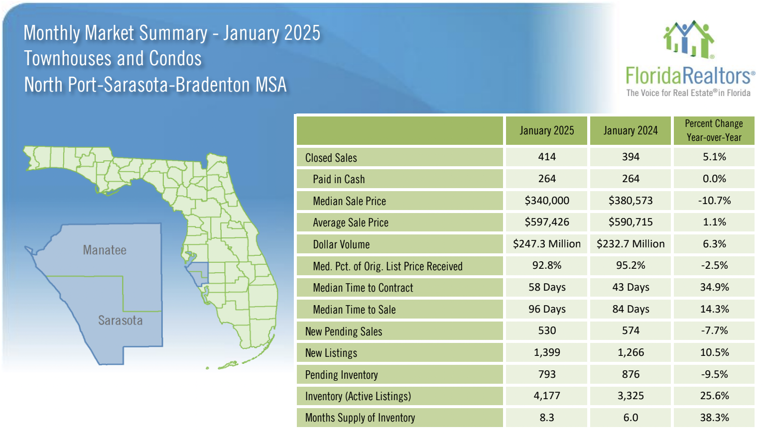 “Median home prices have adjusted in response to increasing inventory, particularly in Sarasota’s condo market,” Reynolds said. “With townhomes and condos in both counties exceeding eight months of supply, market conditions now favor buyers.”