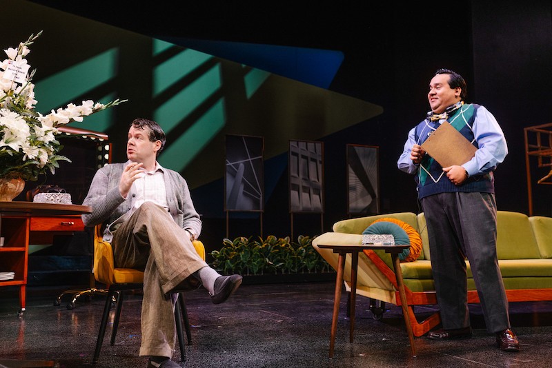 It’s minutes to curtain at the Tonight Show and host Jack Paar can’t exactly promise his studio executive boss, Bob Sarnoff, that tonight’s guest is in the building. Or when he will be. Or if he’s pseudo-escaped from a mental institution and battling hallucinations of Gershwin between desperate bids for more pills. (It’s that last one.) Meanwhile, Mrs. Levant plays the Appropriately Despairing Wife and Oscar’s orderly escort questions every decision in his life that led to abetting a patient’s unauthorized appearance on national television. The ensuing comedy of errors, complete with an angry studio exec and an endlessly quippy Oscar—and buoyed by Asolo Conservatory’s own Jonathan Acosta, in a hilarious turn as the starstruck Max Weinbaum—plays out as you’d expect, punctuated by moments of drama that ultimately pull their punches.