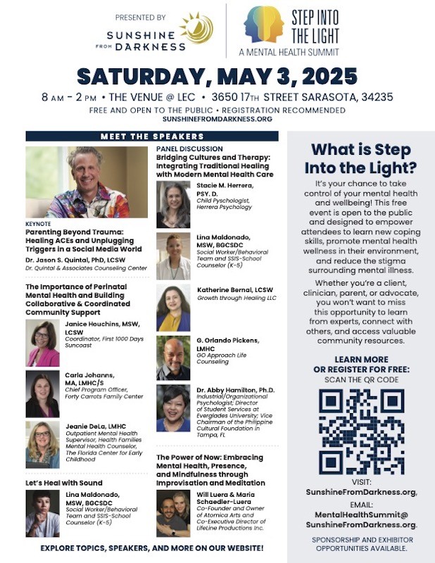 Step Into the Light; A Mental Health Summit takes place Saturday, May 3, 2025 from 8am-2pm at The Harvest House Campus, 3650 17th Street, Sarasota.