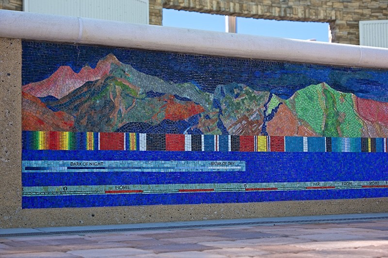 Pictured: Night to Day, Here and Away by Ellen Driscoll is a vibrant mosaic mural located along the Rostrum and South Walkways at Patriot Plaza in Sarasota National Cemetery. The artwork symbolizes the journey of service members, traversing time, distance