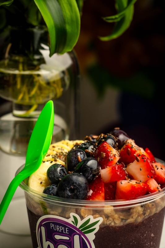 “An açaí bowl is basically a smoothie bowl. We start with the açaí bowl and mix it with something to sweeten it, because the berry by itself doesn’t have a lot of sweetness,” Scarabelli explains. “At Purple Bol, we use banana and apple juice. We make a really thick smoothie that goes on the bottom of the bowl and then we top it with granola, fruit and a bunch of other yummy toppings.”