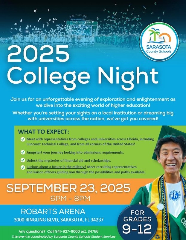 Sarasota County Schools’ College Night is an annual event that connects students and families with representatives from colleges, universities, technical schools, and military programs. The evening is designed to help high school students explore their postsecondary options, learn about admissions requirements, financial aid & scholarship opportunities, and gather information to make informed decisions about their future. Attendees can speak directly with admissions counselors, ask questions, and collect resources, all in one convenient location. Whether students are planning to attend a four-year university, community college, trade school, or join the military, College Night offers valuable insights and guidance for every path.