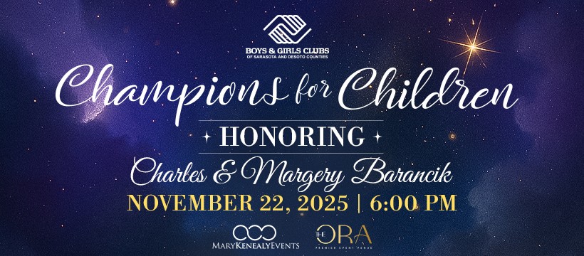 Join Boys & Girls Clubs of Sarasota and DeSoto Counties on Saturday, November 22, 2025, at The Ora for the annual Champion for Children gala. This special evening celebrates the hope and opportunity that empower the young people served by the Clubs every day. This year, BGCSDC proudly honors the lasting legacy of Charles and Margery Barancik, visionary philanthropists whose belief in youth continues to inspire and shape futures. Their generosity has fueled innovative programs, scholarships, expanded staffing, critical operations, and new Club spaces. Guests will enjoy a night of inspiration as moments of the mission come to life alongside a reception, delicious three-course dinner by Michael’s on East, live and silent auctions, and moving performances by Club members. Together, we will continue building a brighter future for every child. Secure your seat today and join us in honoring the Baranciks. For more information, call 941-366-3911 or visit bgcsdc.org.