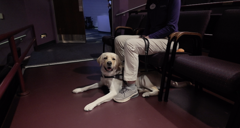 At the Van Wezel, the dogs were introduced to an entirely new environment—one full of distractions, obstacles and challenges that they will encounter in their future roles as guide dogs. “Coming to the Van Wezel is something that we’ve never done before. This opportunity is so wonderful because we have a lot of graduates that still go to the movies or to the theater or private concerts in settings like this,” says Blanco. “They were able to go on different staircases—some are curvy, some are straighter—and elevators which are always different from one another. They were able to work on food refusal with staged volunteers—if there is say popcorn on the ground, that’s a real life thing that happens when walking around a concert hall.”