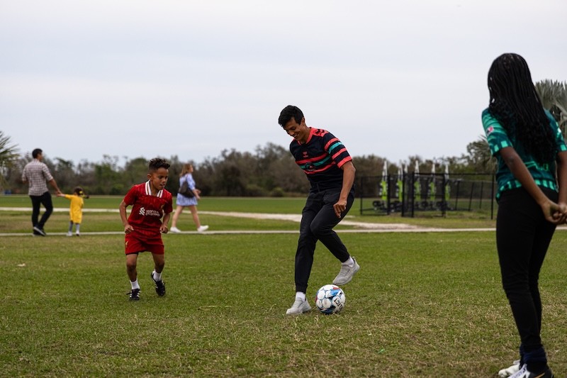 Sarasota Paradise's Felipe Rojas kicks around a ball with a local youth player. Provided photo.