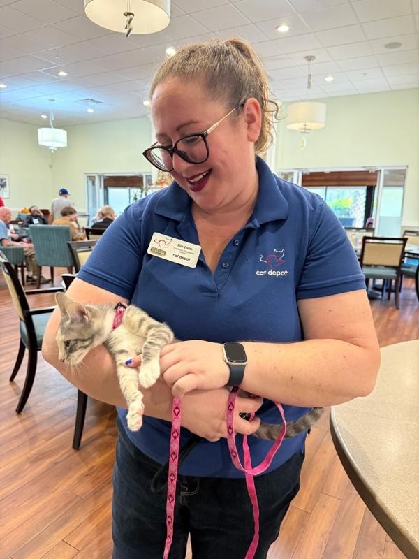 Ellie Levine, Cat Depot's Community Engagement Manager, explained the process and benefits of these visits. "When I bring cats from Cat Depot to senior centers, we pass the kitties around from person to person to give everyone some time to cuddle," she said. Levine noted that these visits are mutually beneficial: "We have found that these visits are not only beneficial to the seniors by putting a smile on their faces, reminding them of their past pets and giving them a sweet way to spend their day, but it also benefits the cats." She added that many cats return from these outings more socialized and are often adopted quickly afterward. These visits also provide valuable information for potential adopters, helping staff assess how the cats handle carriers, car rides, harnesses/leashes and interactions with the senior population.