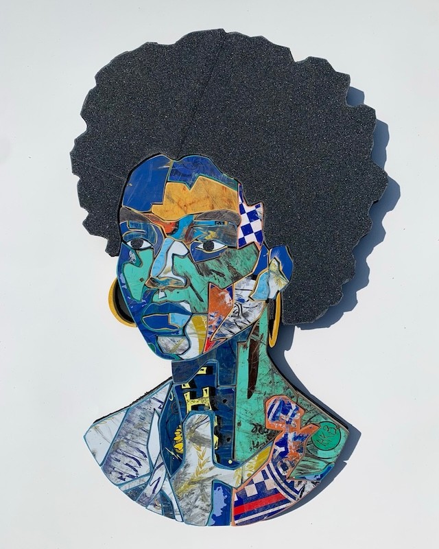 What began as a way to stave off boredom has evolved into a full fledged artistic practice. Perren likens his work to stained glass—using just the boards themselves, without the use of added paint—he manipulates pieces of skateboards to create various types of sculptures and reliefs. Oftentimes these sculptures are depictions of his friends and fellow skaters, other times they are more abstract, such as figurines that use the wheels of the boards as “heads”. “I’ll often take pictures or drawings that I have and put them together on my Ipad to make a template or pattern for the piece, similar to a mosaic. A skateboard is curved, so I have to use smaller pieces of each board to make the work flat,” says Perren. “I print out a pattern—like if you were creating a template for stained glass—and then build it piece by piece, using a scroll saw to cut up the boards before sanding them down and putting it together like a puzzle.”