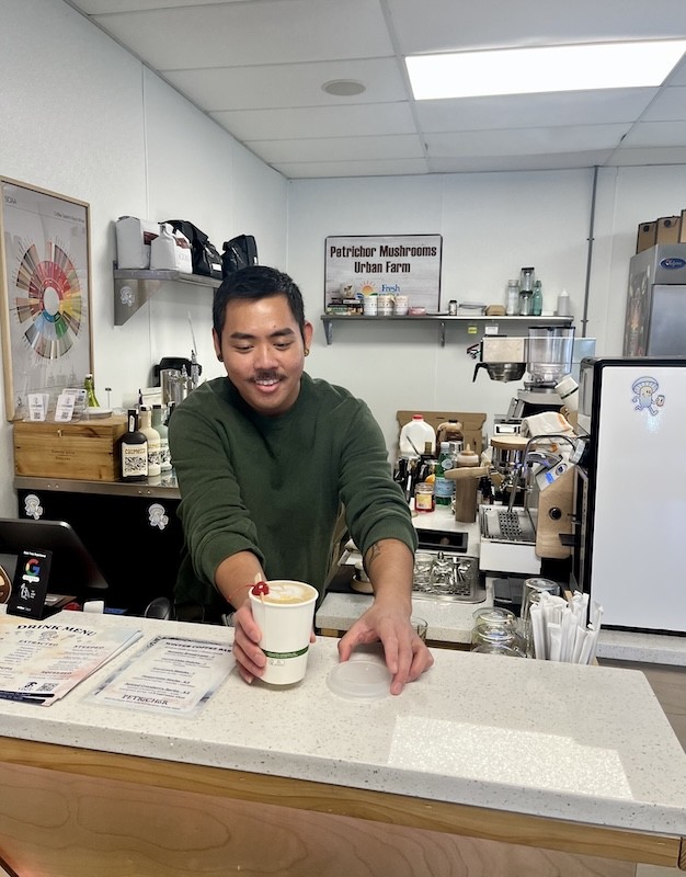 Pictured: Cafe Manager Tom Quach serves up his Carrot Cake matcha latte. Photo by Sarah Emily Miano.