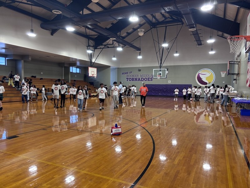 Members of the Baltimore Orioles participate in a physical education class at Booker Middle School. Photo by Dylan Campbell.