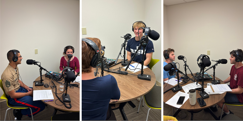Pictured: (Left to right) Debbie Brannon interviews Staff Sargeant Jayvin Rivera, Aaron Nielsen talks with a Student Success Coach, Brothers Nate G and Jake G practice a mock podcast. Provided photo.