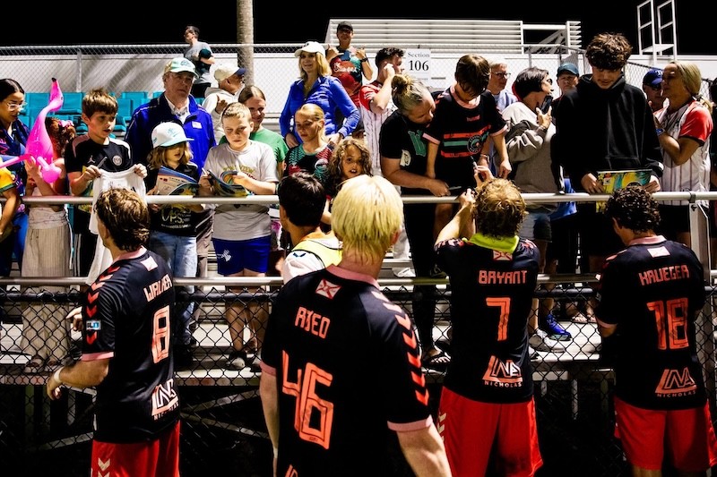 Sarasota Paradise midfielder Sander Roed (middle) greets the fans after Saturday's match against FC Fort Wayne. Provided photo.