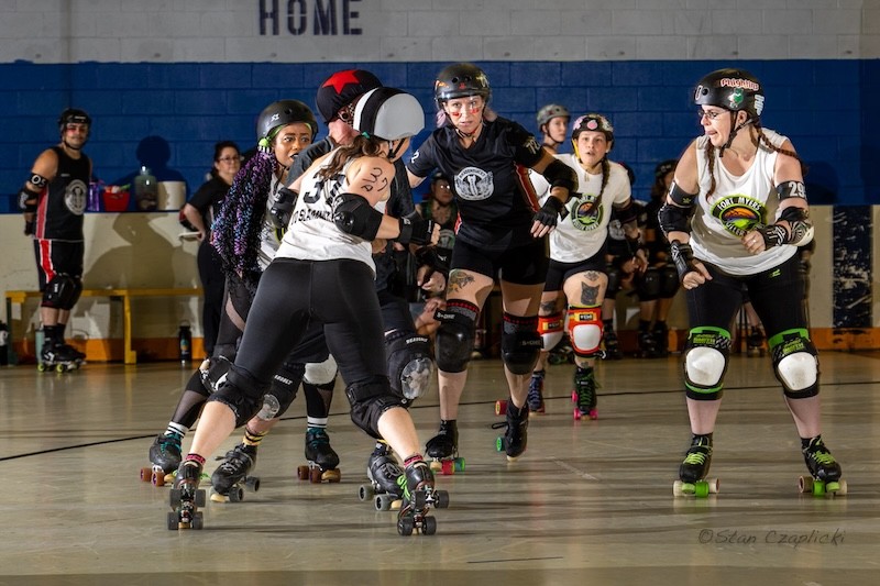 Played on quad skates on an oval track, roller derby is not a sport for the faint of heart. There is no ball, net or goal, only two teams of five skaters apiece vying to physically force their way past their competitors. Games are played over the course of two 30 minute halves—during each two minute scoring periods known as “jams”, four “blockers” from each team position themselves in a formation akin to an elongated rugby scrum, with one “jammer” from each team lined up next to each other behind the blockade. The goal of each “jammer” is to first break past the blockade, gaining “control” of the jam and then to score points by lapping as many blockers as possible. Like in most sports, the team with the most points at the end of the game wins.
